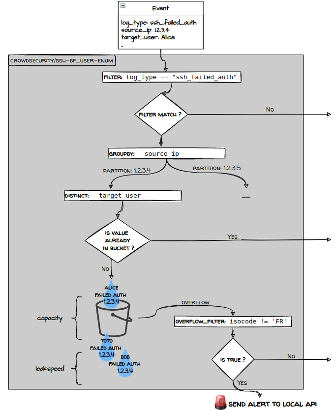 Scenarios receive events and can produce alerts using the leaky bucket algorithm.